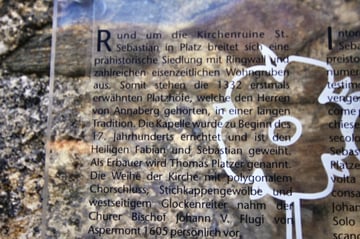 Steigt man immer weiter den Berg hinauf, so kommt man zur Ruine der Sebastianskirche. Der Ort, an dem diese Kirche gebaut wurde strahlt eine wunderbare Ruhe aus. Rund um diese Kirche befand sich eine prähistorische Siedlung mit Ringwall und eisenzeitlichen Wohngruben.